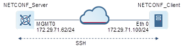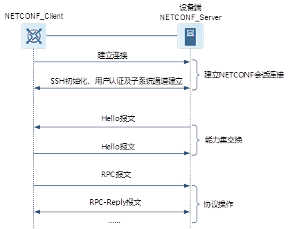 (1) NETCONF传输层依赖于SSH协议。设备上NETCONF服务端启动NETCONF进程后,建立一个监听端口。