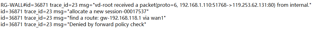 1.110:51661->119.253.62.131:80) from internal. "id=36871 trace_id=1 msg="allocate a new session-00016920" //internal口收到数据,建立新会话