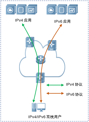 •     对于新建业务系统的场景,推荐采用双栈技术,同时支持IPv4和IPv6,一步到位实现最优改造;