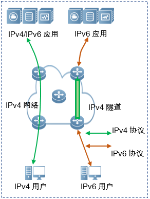 通过隧道技术,依靠现有IPv4设施,只要求隧道两端设备支持双栈,即可实现多个孤立IPv6网络的的互通,但是隧道实施配置比较复杂,也不支持IPv4主机和IPv6主机直接通信。