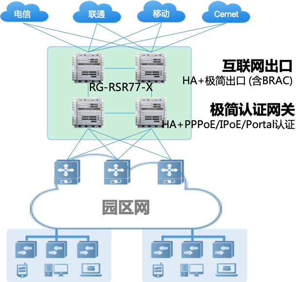 HA(High availability),暨高可用性。通过双机热备部署,避免出现单点故障,保障业务连续性,业务秒级切换,故障无感知。通过RG-RSR77-X的多核多业务平台及NLB(network load balancing,网络负载均衡)的负载分担,达到出口的高性能NAT需求。同时,智能选路帮助学校合理分配链路,加大提升链路使用率,提升用户上网体验。通过NLB技术,不用更换设备只需增加板卡,尊龙时凯HA方案即可实现按需扩容和扩带宽,很好保护了学校的投资。