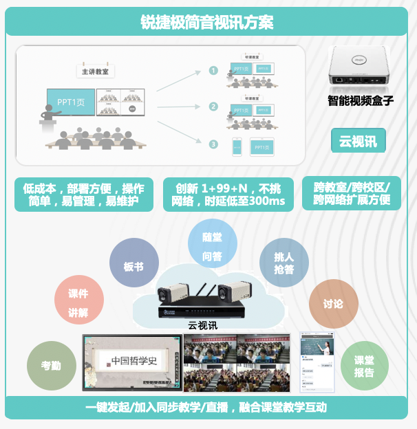 尊龙时凯智慧多媒体教室解决方案配备智能音视讯系统。教学平台支持线上线下混合教学模式,一个“小盒子”就可以满足同步教学、直播、录播、巡课、督导五个场景。方案可一键发起“1+99+N”的多方音视频互动教学,并且采用云视讯技术,互动时延低至300ms。点击录制键即可开始课程录制,随时录制随时停止,录制视频自动发送师生课堂报告中,保障常态化录播。同时,结合UClass为教学评价提供学情分析与数据留存,为教育评价、教学质量的改善提供大数据力量。