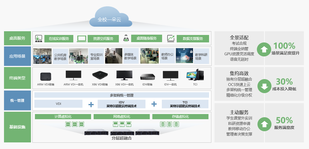终端统一管控,多架构统一纳管,运维双倍提效。高校机房的终端架构多样:IDV、VDI、TCI、PC等等,普通云桌面方案需要管理多套平台,管理成本高。新方案可实现多架构统一管理,无需维护多套平台,实现真正的管理运维提效。