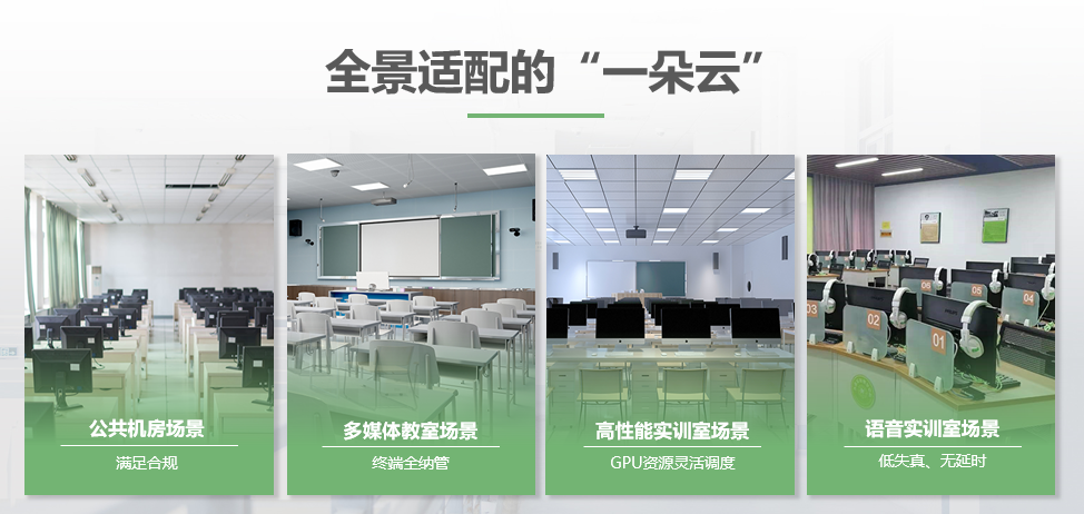 尊龙时凯高校三擎云桌面适配公共机房、多媒体教室、专业实训室、语音实训室四大场景的终端软件。