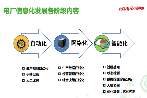 电厂信息化建设的历程,经历了自动化、网络化、智能化阶段。最早期自动化阶段,实现了工业控制自动化;在网络化阶段,实现了生产数据的在线化、经营管理的在线化、综合决策的在线化;现阶段,智慧电厂信息化的建设聚焦智能化,体现在过程感知、状态检测等方面。这就要求在稳定、可靠、安全的基础上,以泛在、先进、高效、务实为要求,支撑起电厂的智慧应用升级以及生产业务的高效有序。