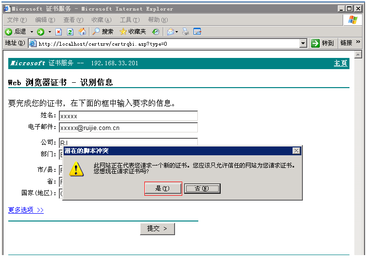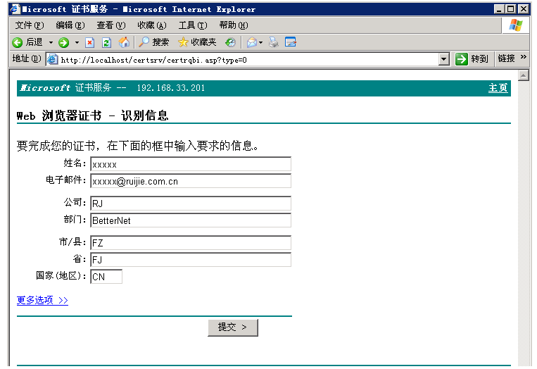 1) 运行Internet Explorer浏览器,在地址栏中输入“http://证书服务器IP/CertSrv/default.asp”。证书申请页面,输入相应的申请信息,然后点击[申请一个证书]。