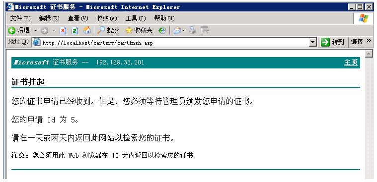 注意: 您必须用此 Web 浏览器在 10 天内返回以检索您的证书,若时间超期,则证书即时颁发成功也无法下载安装。