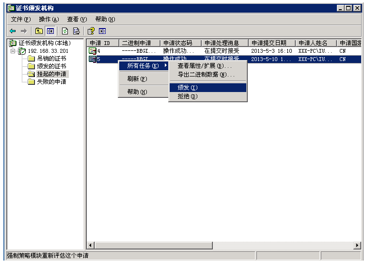 2) 在证书颁发机构窗口,打开“挂起的申请”选项,选中申请ID,右击菜单,执行“颁发”证书。