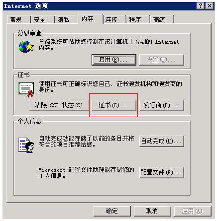 4) 安装完成后,进入IE的“选项”> “内容”,点击进入证书窗口;