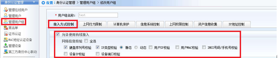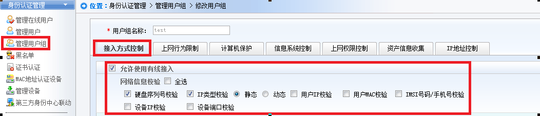 i. 进入SMP管理界面,依次打开“身份认证管理”-“管理用户组”,找到认证失败用户所在的用户组点击修改,在接入方式控制标签取消掉“网络信息校验”中的相关校验内容;