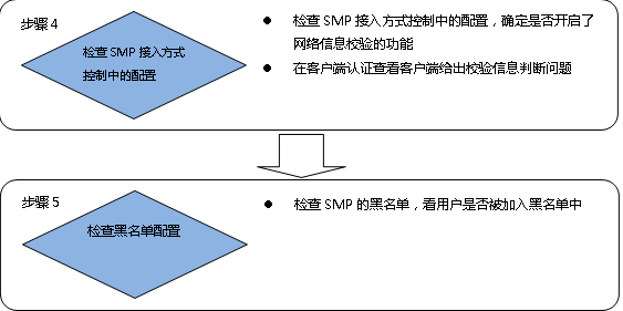 如果在SMP的接入方式控制中进行了配置绑定,当用户认证时的网络校验信息和系统绑定的不一致时,则会出现认证失败的情况。