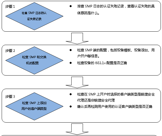 当用户认证失败时,依次检查SMP和接入交换机的配置是否正确: