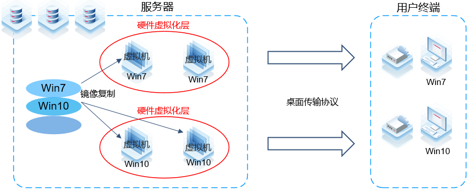 VDI采用集中存储、集中运算的虚拟桌面基础架构,该架构是把所有的用户桌面的数据运算都集中在服务器端,用户桌面接收的只是图像。VDI技术首先在云服务器上安装虚拟化平台将服务器硬件虚拟化,生成多个不同的虚拟机,在虚拟机上安装操作系统和软件,最后通过桌面传输协议将桌面传输到用户终端显示。
