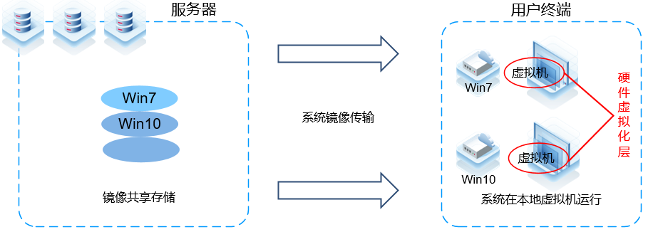 IDV采用集中存储、分布运算的架构,该架构下服务器端存放系统镜像,用户端通过本地虚拟机运行虚拟桌面,计算和存储能力都集中在用户端。IDV技术首先在服务器端存放系统镜像,通过系统镜像传输下发到对应用户终端的硬盘上,IDV终端在硬件主机和操作系统间存在一个虚拟化层,通过虚拟化层直接运行云桌面。