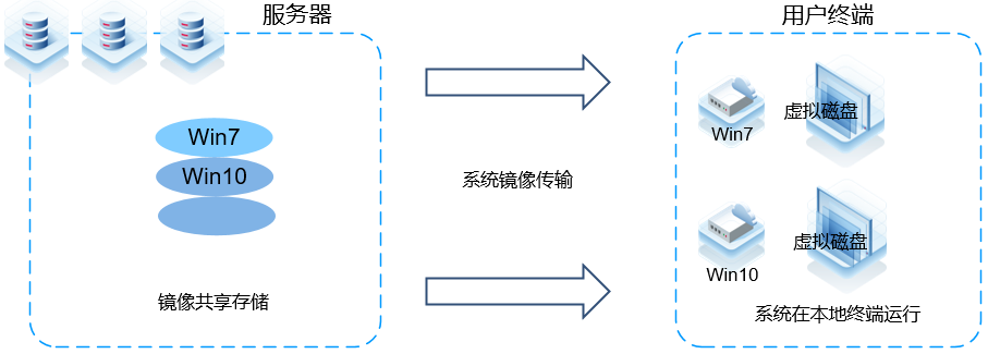 TCI采用集中存储、分布运算的架构,该架构下服务器端存放系统镜像,用户端通过本地终端运行用户桌面,计算和存储能力都集中在用户端。TCI技术首先在服务器端存放系统镜像,通过系统镜像传输下发到对应用户终端的硬盘上,TCI终端通过虚拟磁盘运行操作系统,直接利用终端本地CPU、内存、外设接口等硬件性能,使得操作系统几乎运行在物理硬件上。