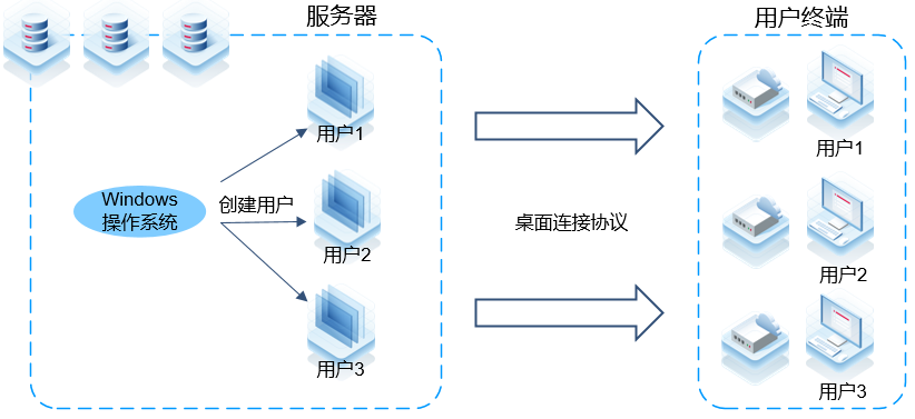 RDS技术基于多用户操作系统,首先在服务器上安装一个Windows系统,在该Windows操作系统上批量创建多个用户帐号,用户使用Windows系统帐号登录桌面。RDS架构的计算和存储能力集中在服务器端,用户端通过桌面连接协议远程访问服务端用户系统。